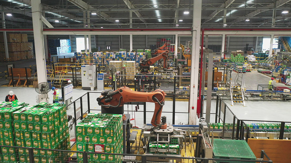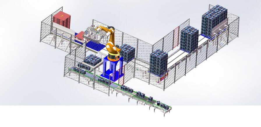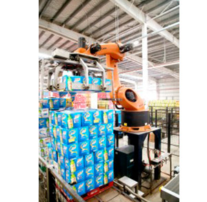 卸垛机是将整垛排列在托盘上纸箱,逐层分解在输送平台上,进行自动分箱, 连接割箱生产线直接上线。本设备采用PLC+触摸屏控制,实现智能化操作管理,简便、易掌握。可大大地减少劳动人员和降低劳动强度。采用高速、平稳、节省空间之理念设计。采用叠加式收集托盘、更快速、更节省空间。一机多用,调整迅速,不必为更换产品规格而烦恼。适用范围:瓦楞纸箱、塑胶箱、桶状包装物。 机械手卸垛采用德国库卡伺服运动控制系统和输垛定位及分箱输送构成,操作简单方便,低能耗等优点在自动化生产线得到广泛使用。 卸垛机抓手设计张开尺寸为:1260mm×1260mm; 可适应垛板尺寸:1100mm×1100mm×150mm; 物体最大尺寸为:1160mm×1160mm×高2000mm 如有其它尺寸的请在订机前说明。 自动纸箱瓶卸垛机包括:垛板输送带、垛板仓、机械手及夹具、卸垛平台、储箱平台、分箱平台、理箱输送、提速输送、转向输送、安全防护装置、 整线控制系统。 |